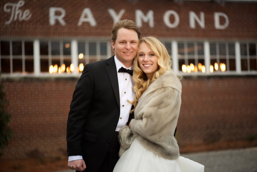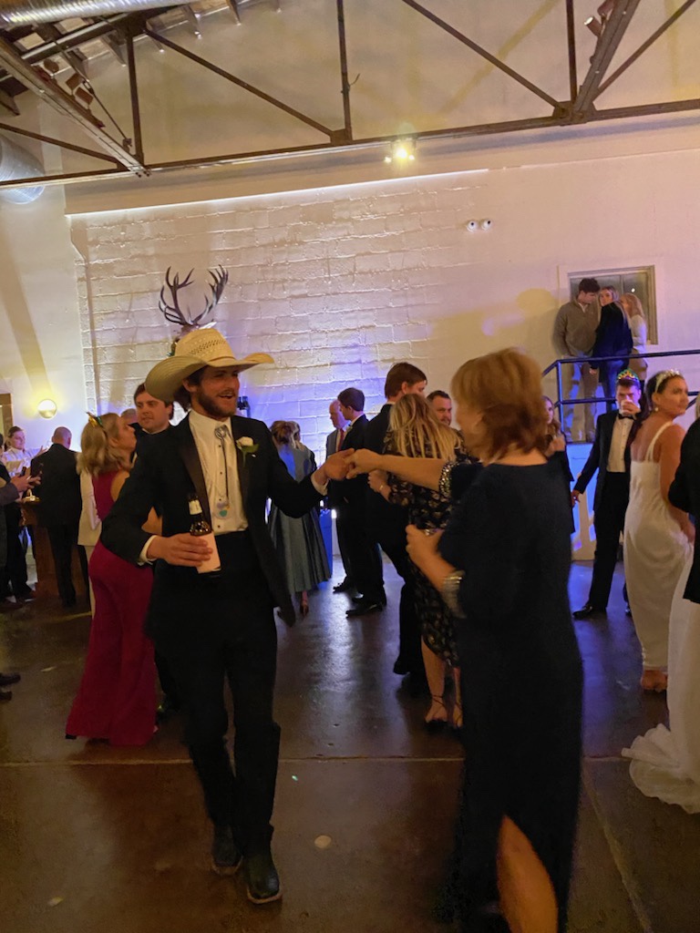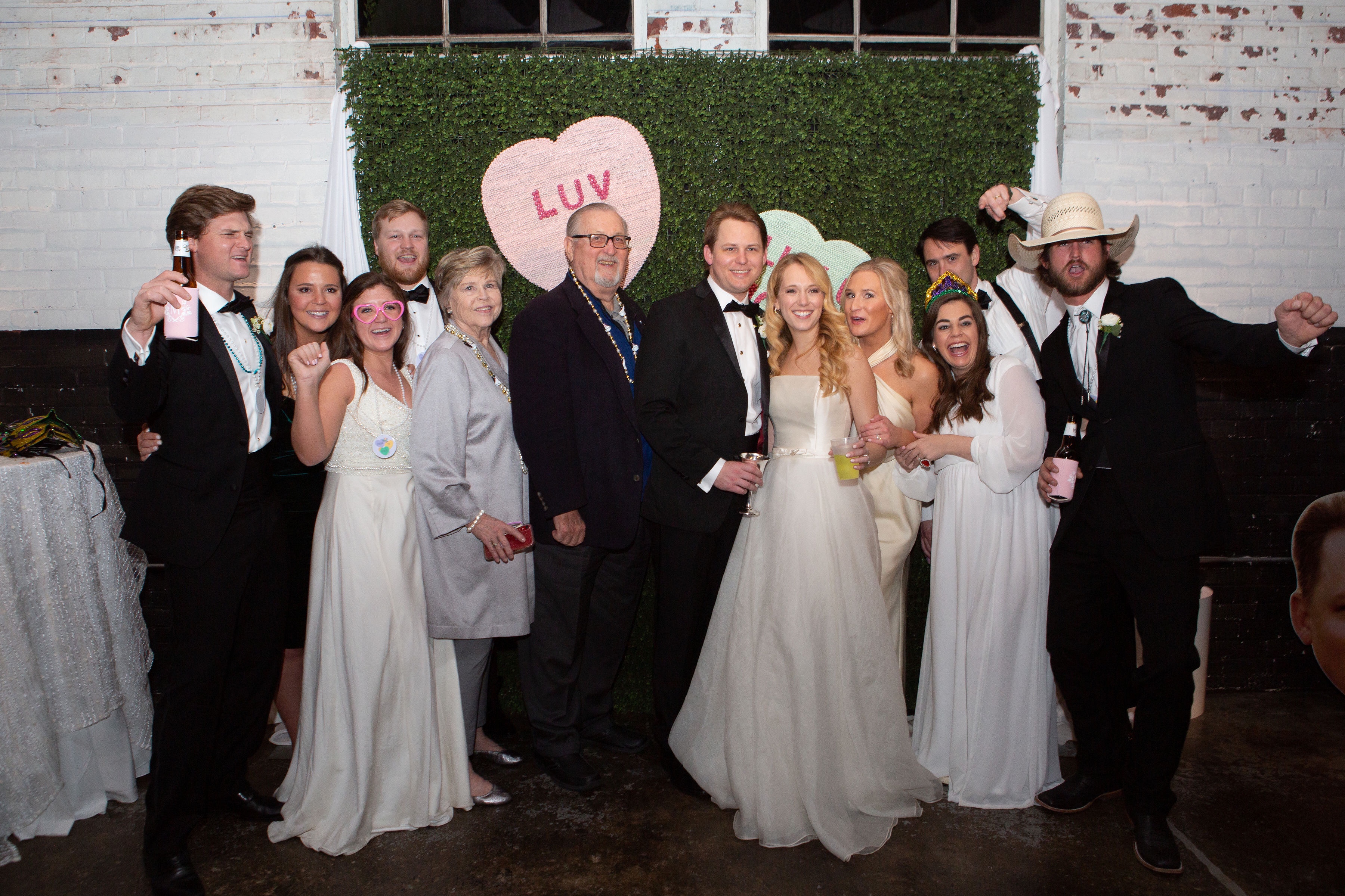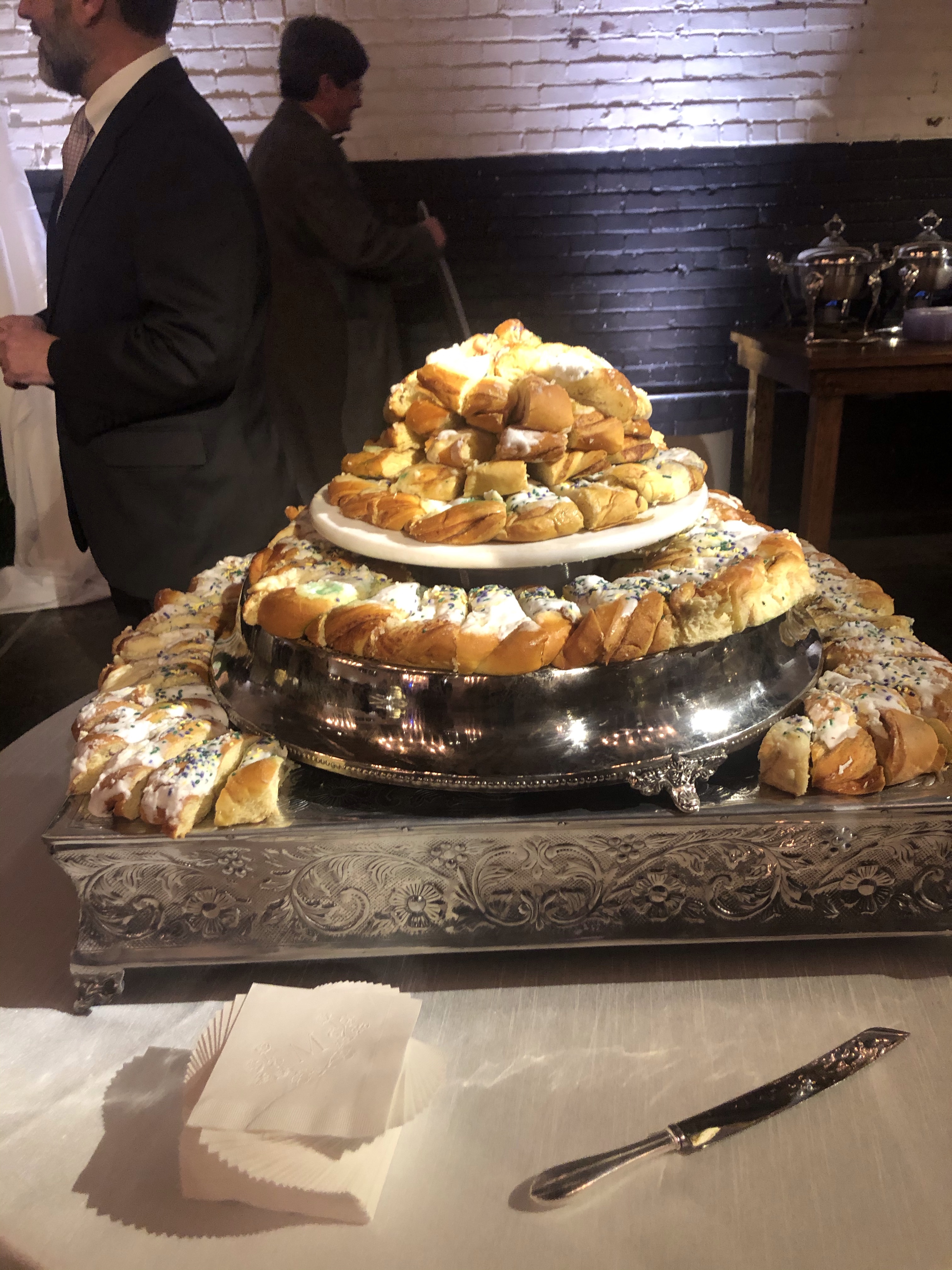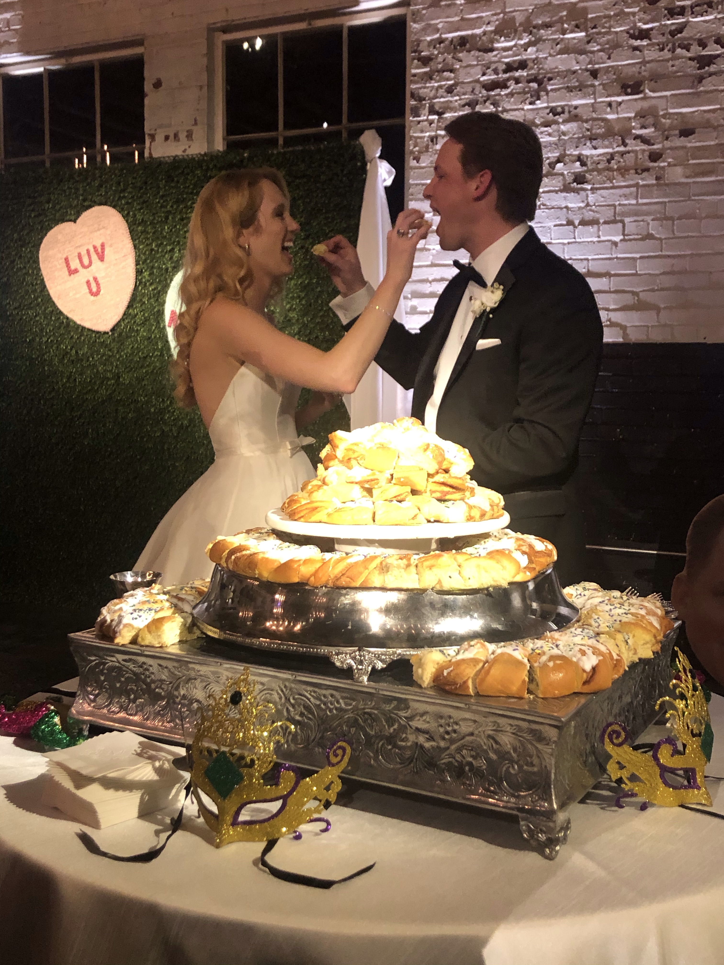 Following the ceremony, the bride’s parents hosted a reception for wedding party and family at The Raymond on the historic square in Raymond, Mississippi. After the couple’s first dance to “You Make Loving Fun” by Fleetwood Mac, sung by Kate Teague, guests were entertained by the Patrick Harkins band. The three-tiered traditional bride’s cake featured a smooth cream cheese frosting. It was displayed on a large silver pedestal adorned with white roses and displayed under a floral wrapped industrial chandelier. The bridegroom’s cake was a five-tiered display of Manny Randazzo’s King Cake from New Orleans.