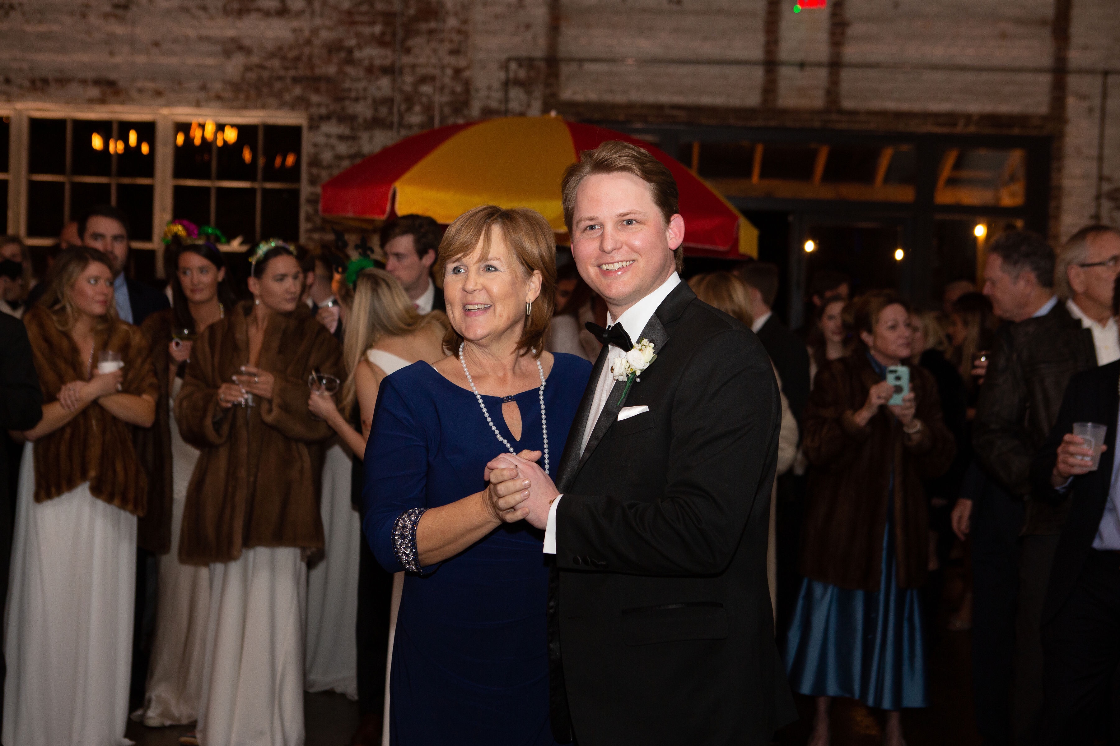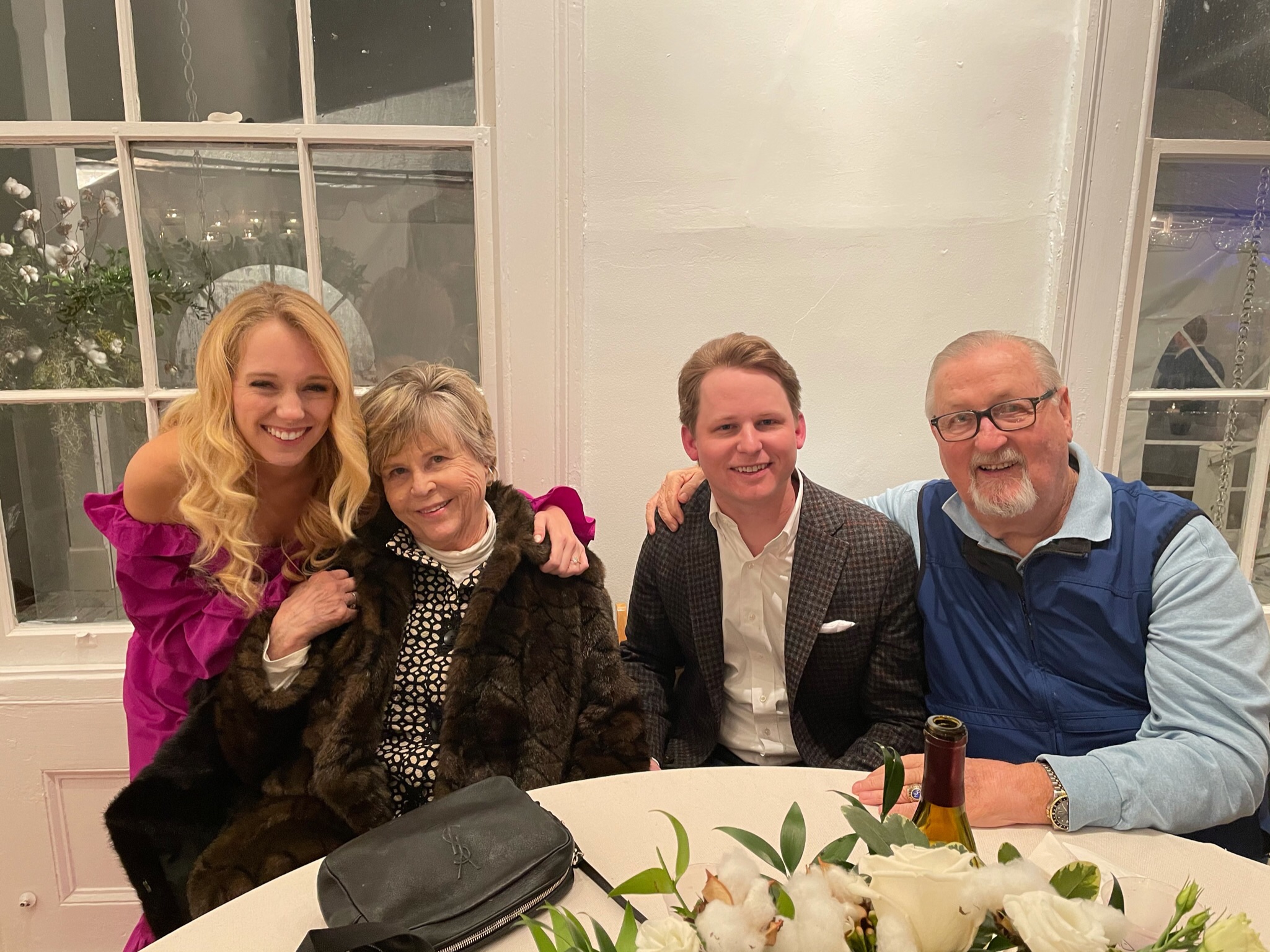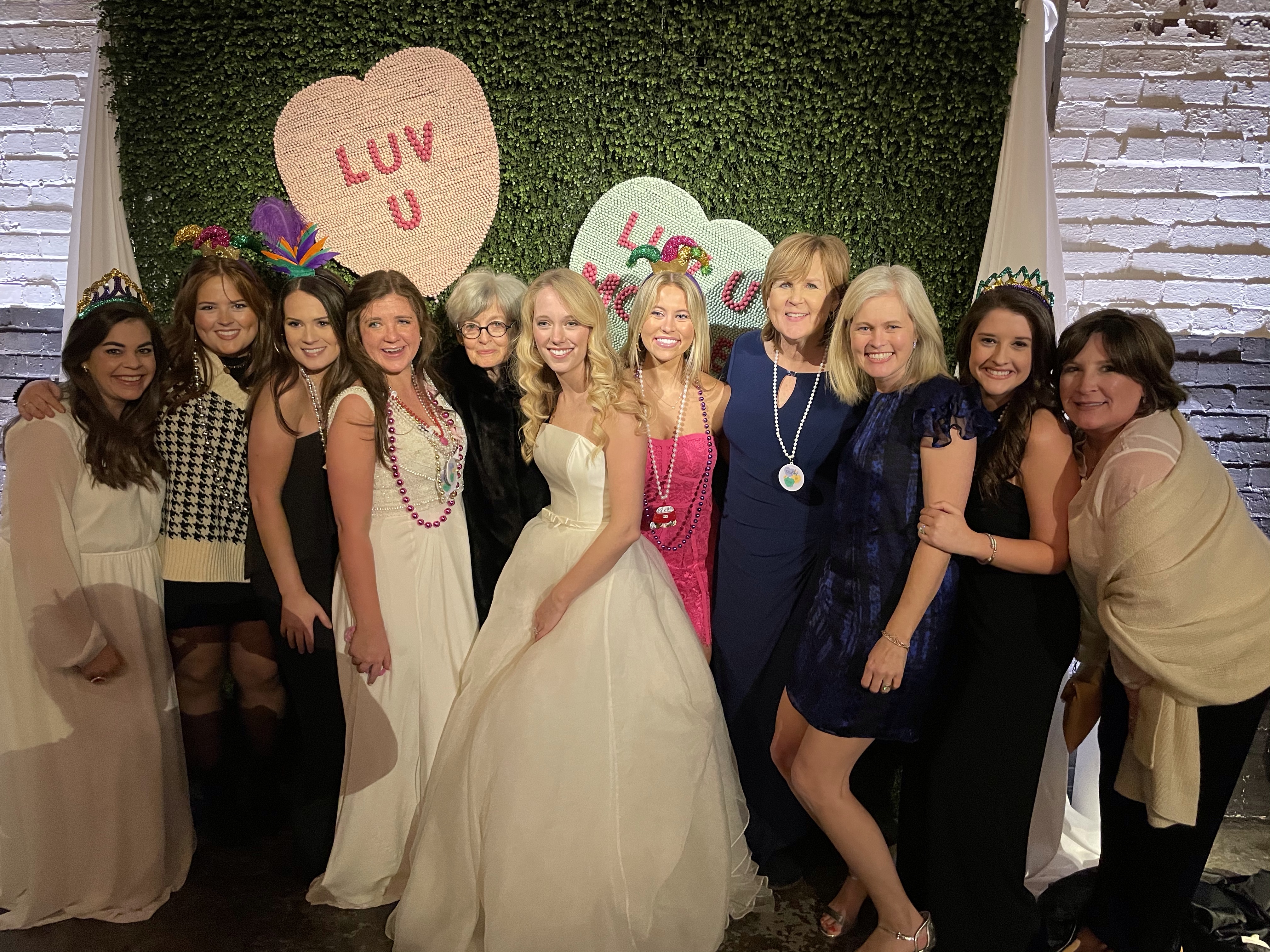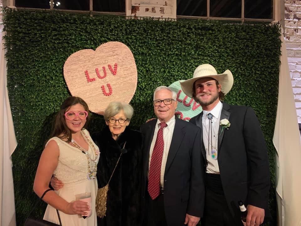Following the ceremony, the bride’s parents hosted a reception for wedding party and family at The Raymond on the historic square in Raymond, Mississippi. After the couple’s first dance to “You Make Loving Fun” by Fleetwood Mac, sung by Kate Teague, guests were entertained by the Patrick Harkins band. The three-tiered traditional bride’s cake featured a smooth cream cheese frosting. It was displayed on a large silver pedestal adorned with white roses and displayed under a floral wrapped industrial chandelier. The bridegroom’s cake was a five-tiered display of Manny Randazzo’s King Cake from New Orleans.