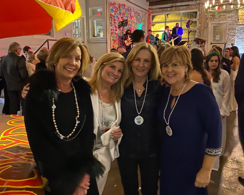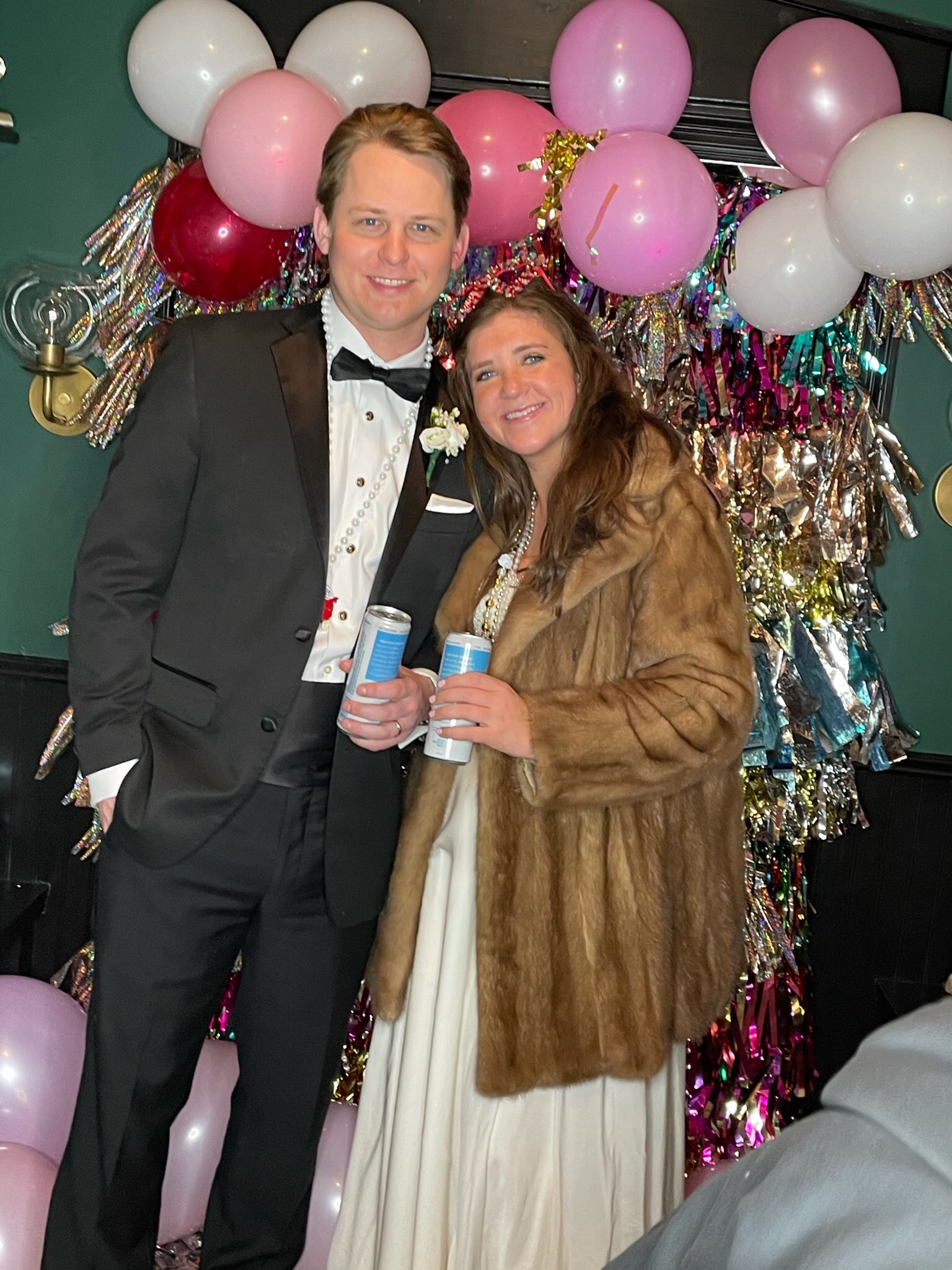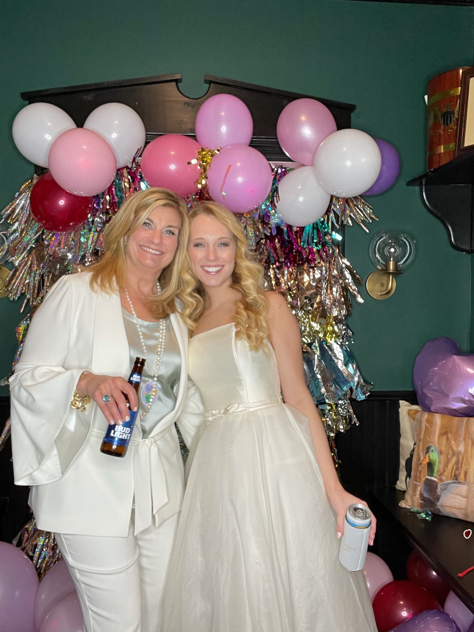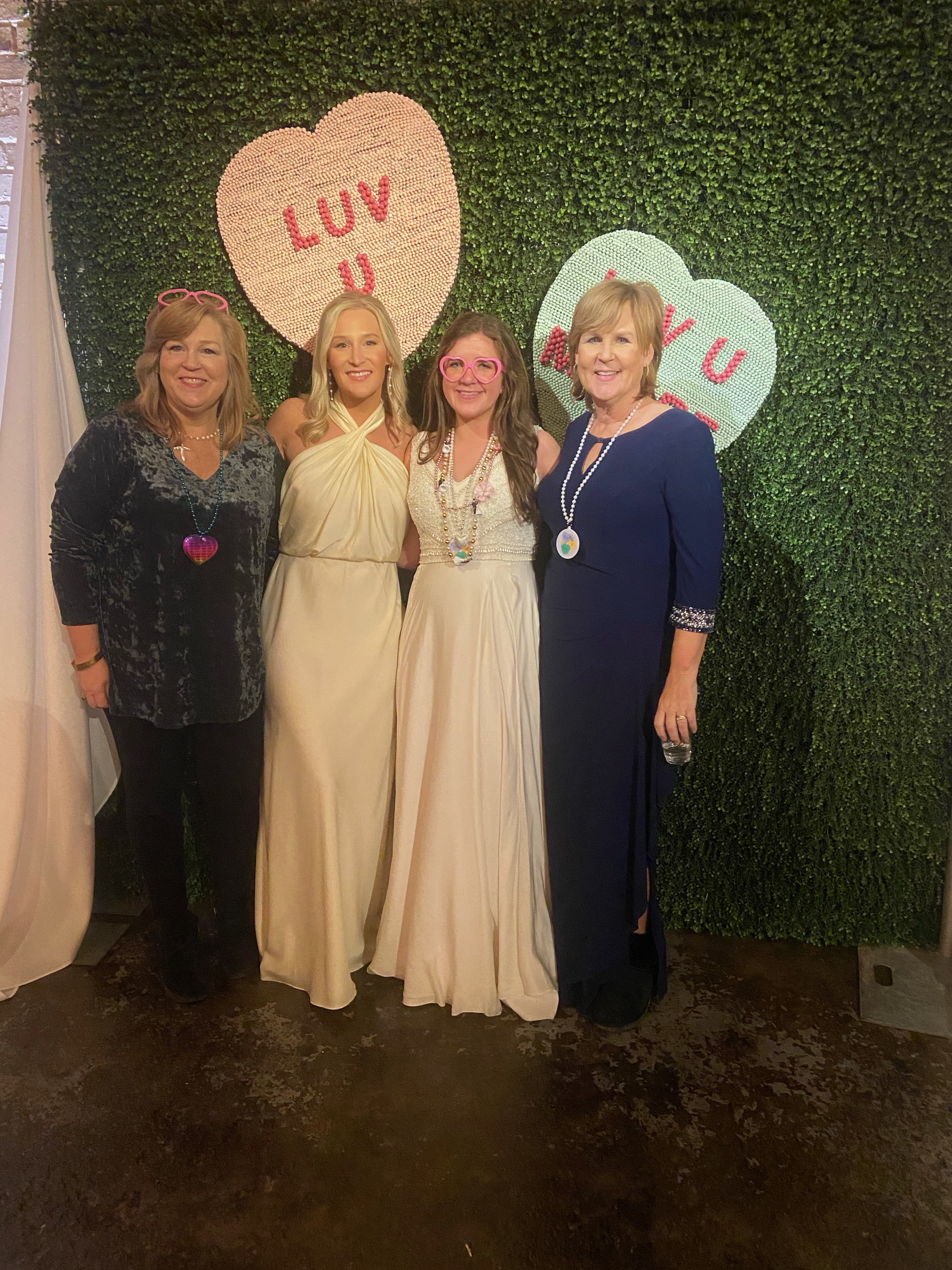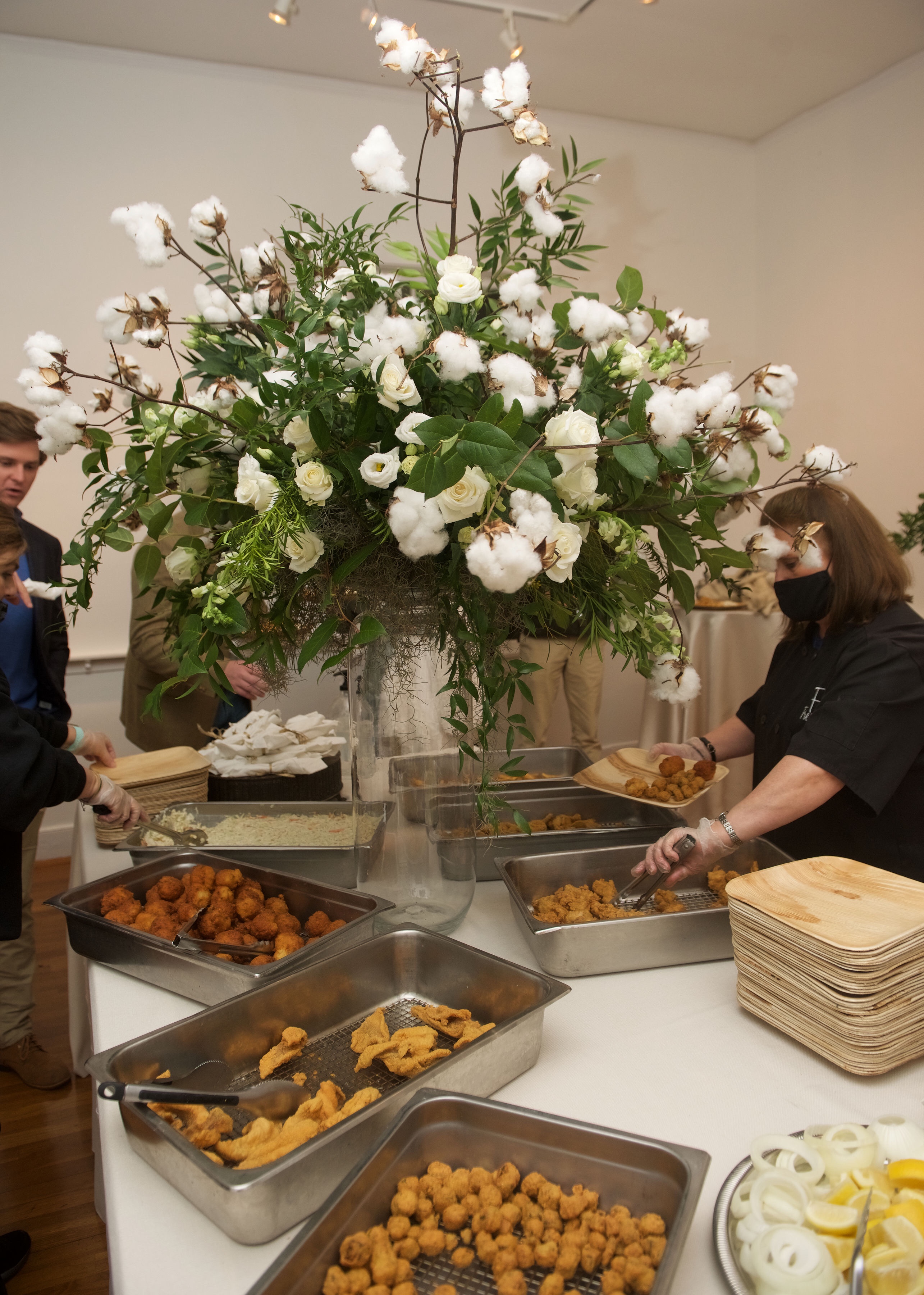 Following the ceremony, the bride’s parents hosted a reception for wedding party and family at The Raymond on the historic square in Raymond, Mississippi. After the couple’s first dance to “You Make Loving Fun” by Fleetwood Mac, sung by Kate Teague, guests were entertained by the Patrick Harkins band. The three-tiered traditional bride’s cake featured a smooth cream cheese frosting. It was displayed on a large silver pedestal adorned with white roses and displayed under a floral wrapped industrial chandelier. The bridegroom’s cake was a five-tiered display of Manny Randazzo’s King Cake from New Orleans.