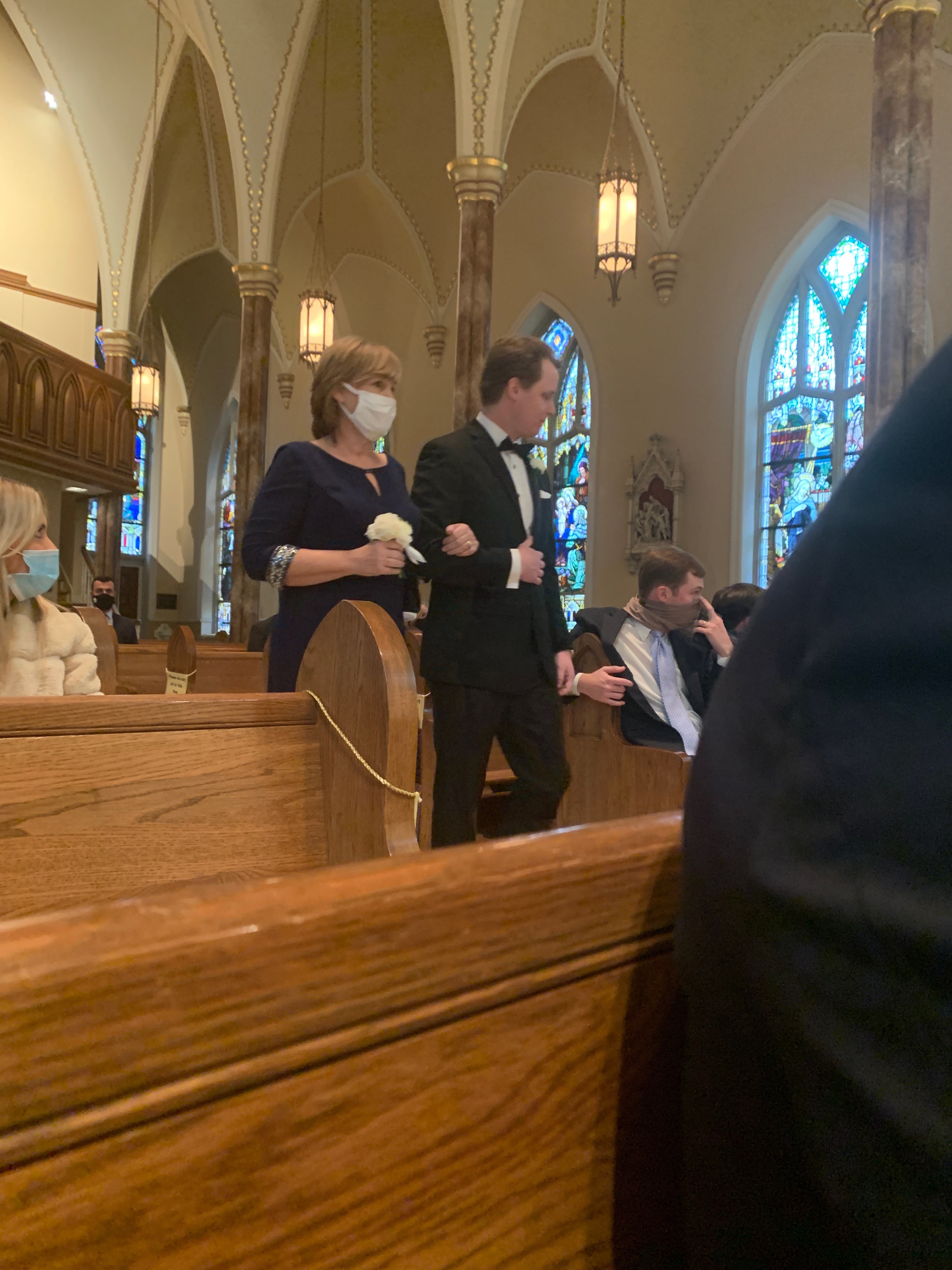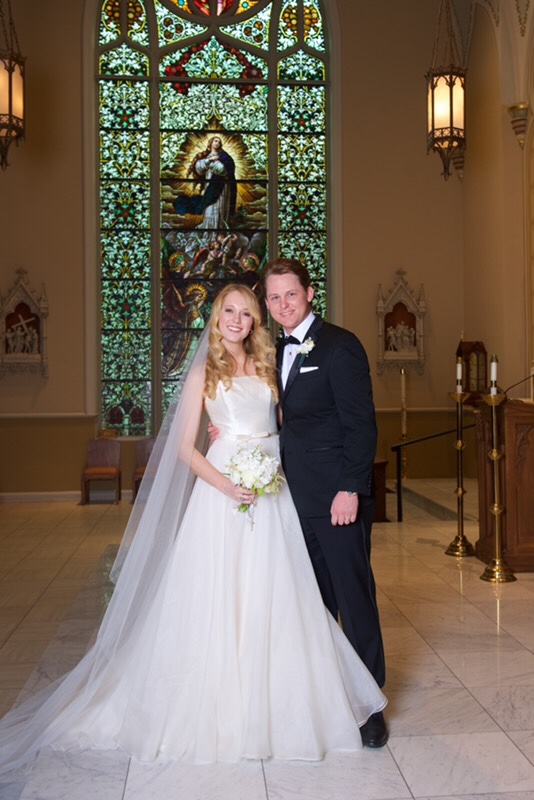 Given in marriage by her parents, the bride wore a custom Britt Wood Designs LLC of Atlanta, Georgia white strapless gown with a low back silk Mikado bodice and an A-line skirt made of silk organza with a chapel train. She finished her ensemble with a royal cathedral veil made of silk tulle. Her bouquet was filled with queen annes lace, ranunculus, astilbe, stock and lily of the valley. The bouquet was complete with a family rosary, diamond and gold rings, blush pink silk ribbon and monogrammed double faced satin ribbon.